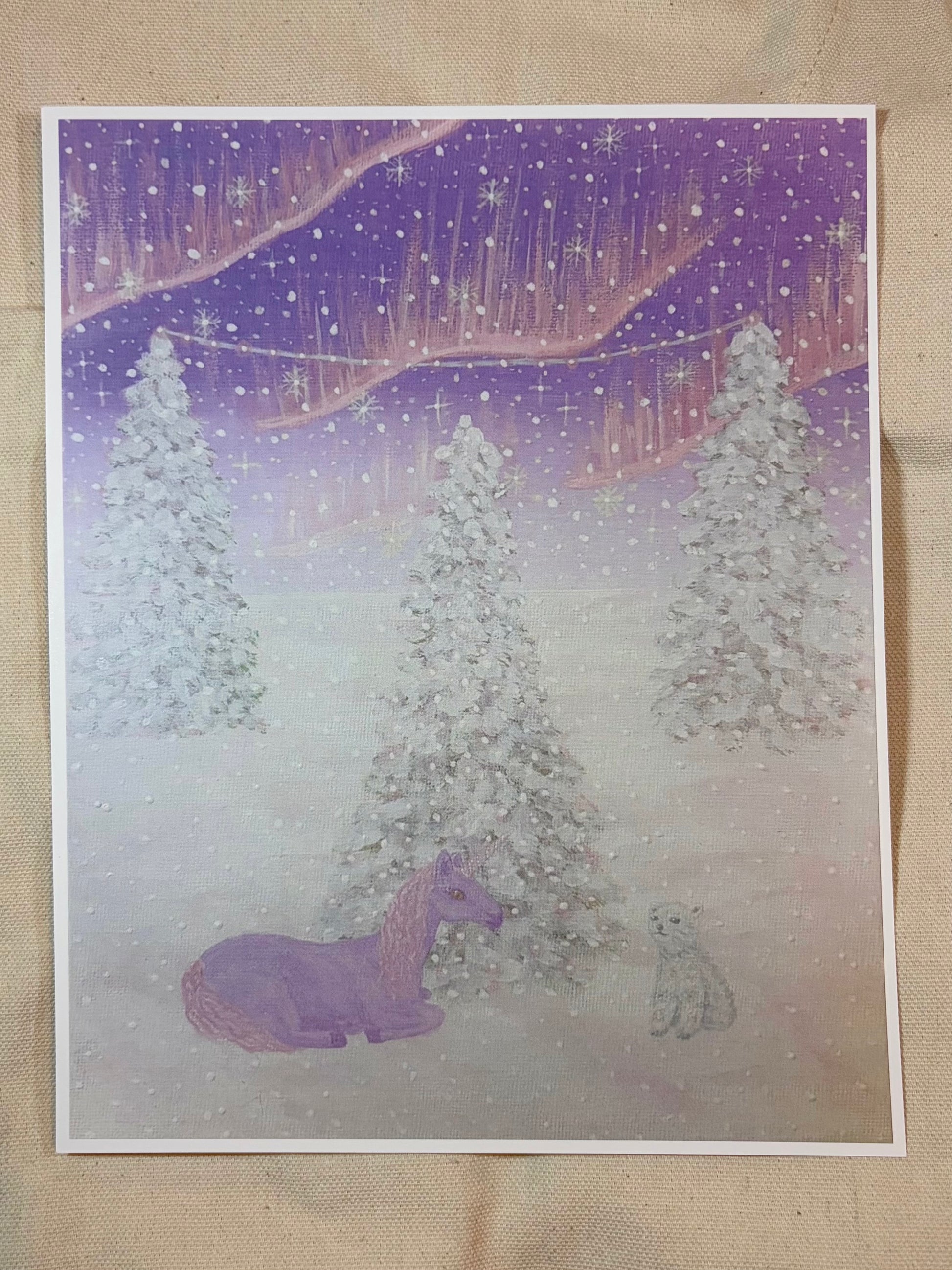 A winter scenery with a purple unicorn and baby polar bear hanging out under pink auroras.